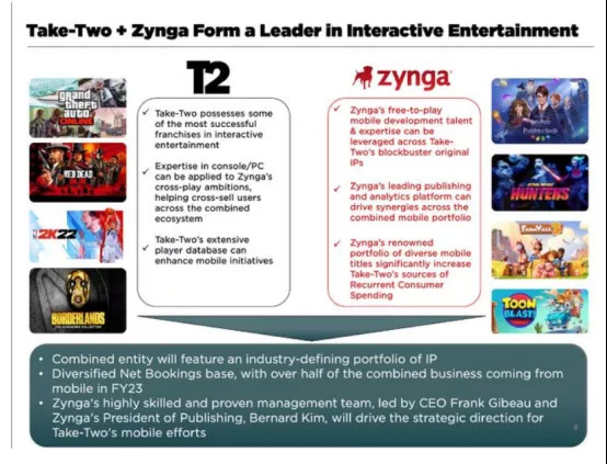 在收购Zynga之前,Take-Two在手游领域属于小打小闹,移动游戏收入占比极其有限。根据官方预计,收购完成后移动平台将占其2023 财年净Booking收入的 50% 以上,而 2022 年这一数字预估仅为12%。