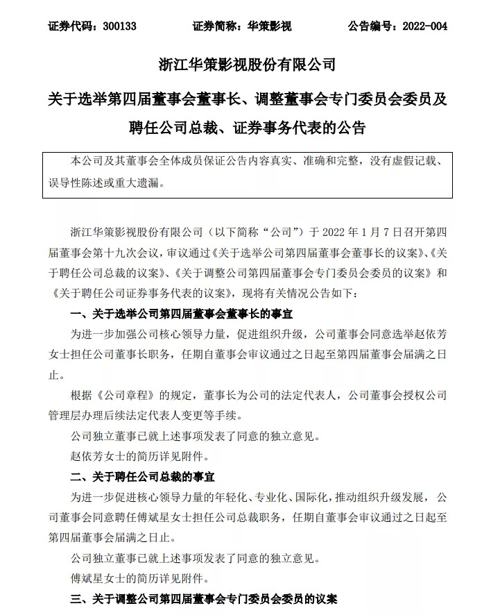 1月9日华策影视发布公告显示,为进一步促进核心领导力量的年轻化、专业化、国际化,推动组织升级发展,公司董事会同意聘任傅斌星女士担任公司总裁职务,成为公司名义上的二把手。
