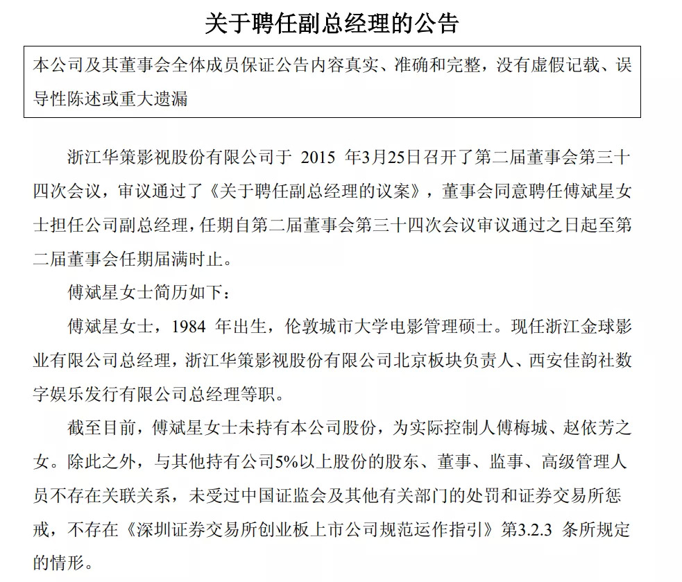 3年后的2015 年3月25日,华策影视聘请傅斌星担任公司副总经理,她作为接班人培养的信息才正式浮出水面,她以创始人千金的身份走向家族企业的台前,主要负责华策影视北京分部的业务。