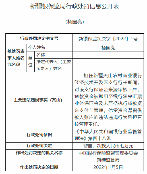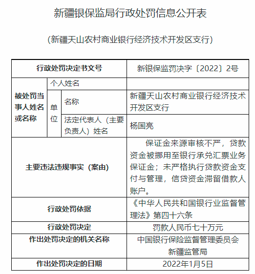 1月11日,新疆银保监局行政处罚信息公开表显示,新疆天山农村商业银行经济技术开发区支行因保证金来源审核不严,贷款资金被挪用至银行承兑汇票业务保证金;未严格执行贷款资金支付与管理,信贷资金滞留借款人账户,被新疆银保监局罚款人民币70万元;该行法定代表人杨国亮担任新疆天山农村商业银行经济技术开发区支行行长期间,对该支行保证金来源审核不严,贷款资金被挪用至银行承兑汇票业务保证金及未严格执行贷款资金支付与管理,信贷资金滞留借款人账户的违法违规行为承担直接管理责任,被新疆银保监局警告,并处罚款人民币7万元。以上作出处罚决定的日期为2022年1月5日。