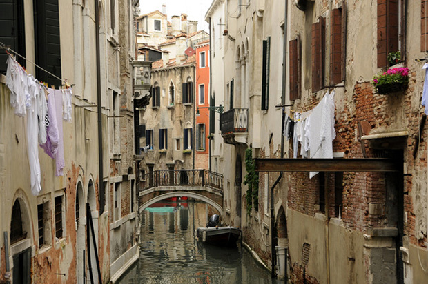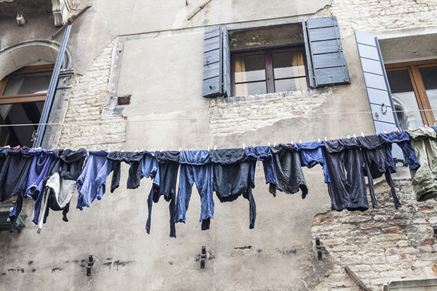 在维纳斯的鹅卵石小巷子穿梭,经常会看到从自家连到邻居家的晾衣绳。干衣机在意大利是珍稀品,历史家族中的女人满怀自豪,一丝不苟地晾挂着他们家里的服饰。总有种正确的方法风干从亚麻织物到内衣裤的所有东西。晒衣服的日子里,洗衣液的香气和咸水河道的味道混杂在一起,在这些日子中单是从人们的晾衣技巧和礼节就能知道邻居的很多事情。