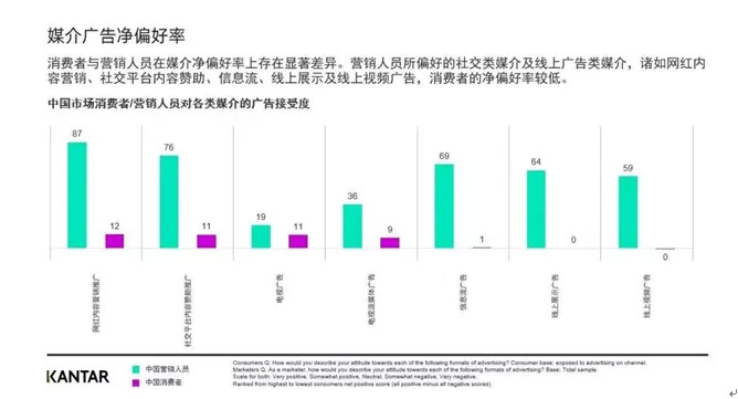 此外,很多营销人员认为,什么营销方式流行,就应该无限跟进。但事实上,凯度中国最新推出的《Media Reactions 2021》指出,营销人员与消费者对不同渠道广告的接受度存在差异。例如,营销人员偏好率高达87%的网红内容营销,消费者却往往无感,偏好率仅在10%左右甚至以下。