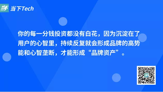 而且,通过这样的方式,你的每一分钱投资都没有白花,因为沉淀在了用户的心智里,持续反复就会形成品牌的高势能和心智垄断,才能形成“品牌资产”,才会给你那70%的销量回报。