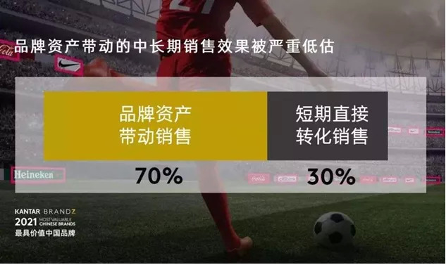 凯度中国的研究结果就显示——品牌资产所带动的中长期销售效果被严重低估了:所有销售中,70%的销售是在中长期发生的,由品牌资产贡献;而短期直接转化实现的销售只占30%。