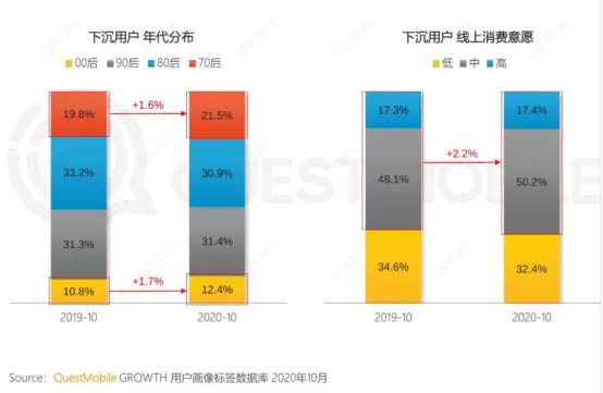 从不同代系看,00后、70后是下沉进一步增长的潜力人群;下沉用户的线上消费意愿也在进一步增长。