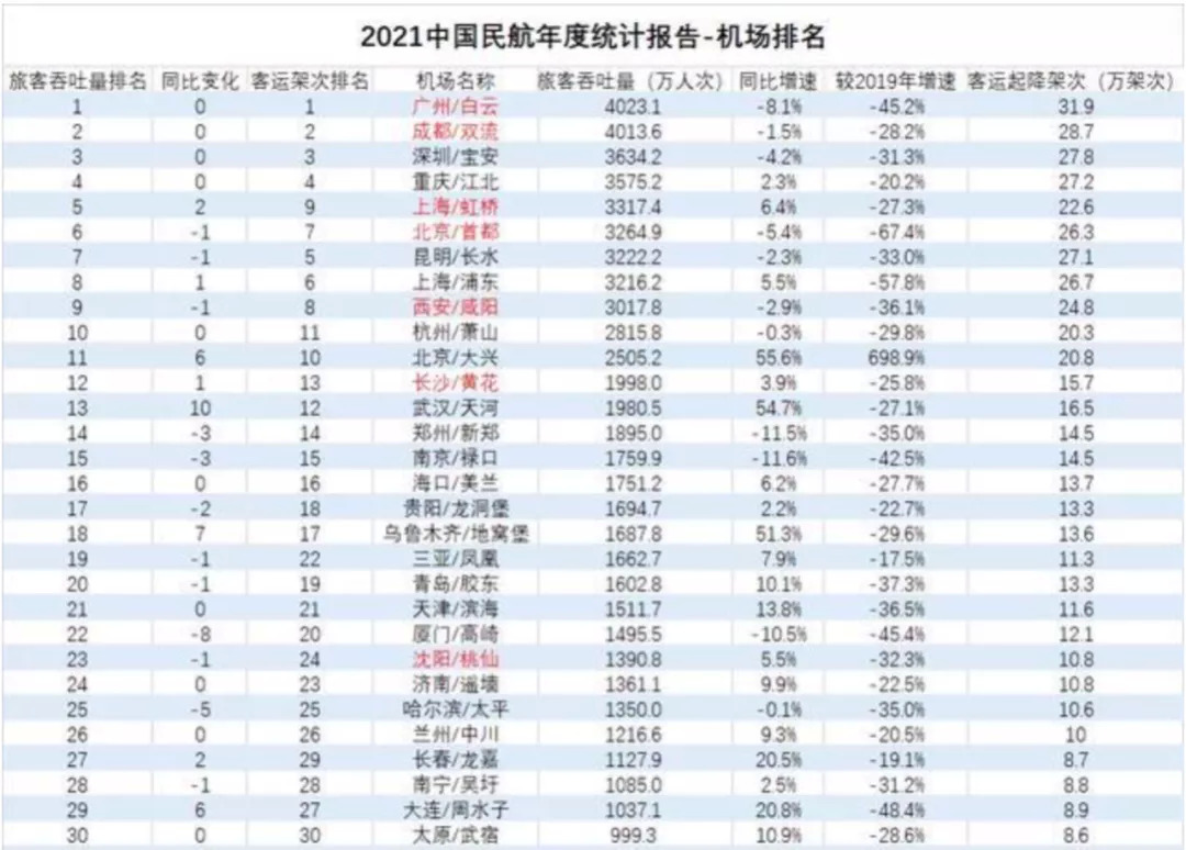 其中,前十名的机场为:广州白云、成都双流、深圳宝安、重庆江北、上海虹桥、北京首都、昆明长水、上海浦东、西安咸阳、杭州萧山。