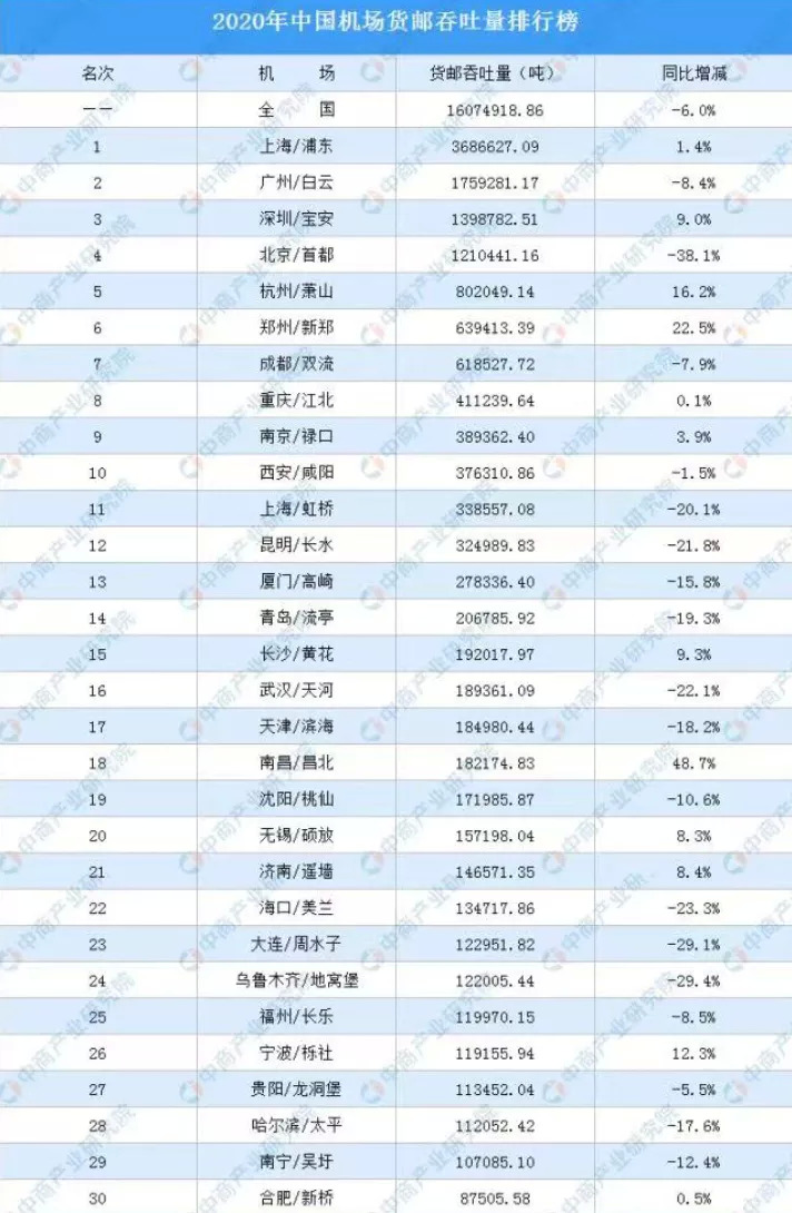 货邮吞吐量,暂未找到2021年的数据。2020年前30强的排名如下: