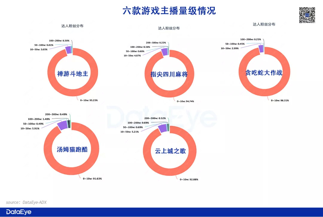 3、从达人粉丝量来看:0-10万粉的达人居多,这主要因为抖音游戏直播目前处于初级阶段,参与的达人大多仍处于粉丝累积阶段,超过50万粉的本就数量极少。此外,与斗鱼、虎牙、YY的头部主播(不少为电竞选手或游戏达人)相比,抖音游戏主播相对业余、分散、知名度也较低。