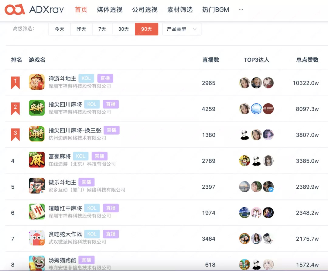 DataEye-ADX数据显示,近90天,一大批棋牌类、休闲类游戏已进行数千场抖音游戏直播。其中,总点赞数最高的《禅游斗地主》已进行了2965场直播,每日直播约33场,总点赞数高达1个亿(游戏直播点赞可以多次操作、累积叠加,因此奇高)。中重度游戏中,《斗罗大陆:武魂觉醒》、《云上城之歌》都以进行了过千场游戏直播,分别收获859万、702万点赞。
