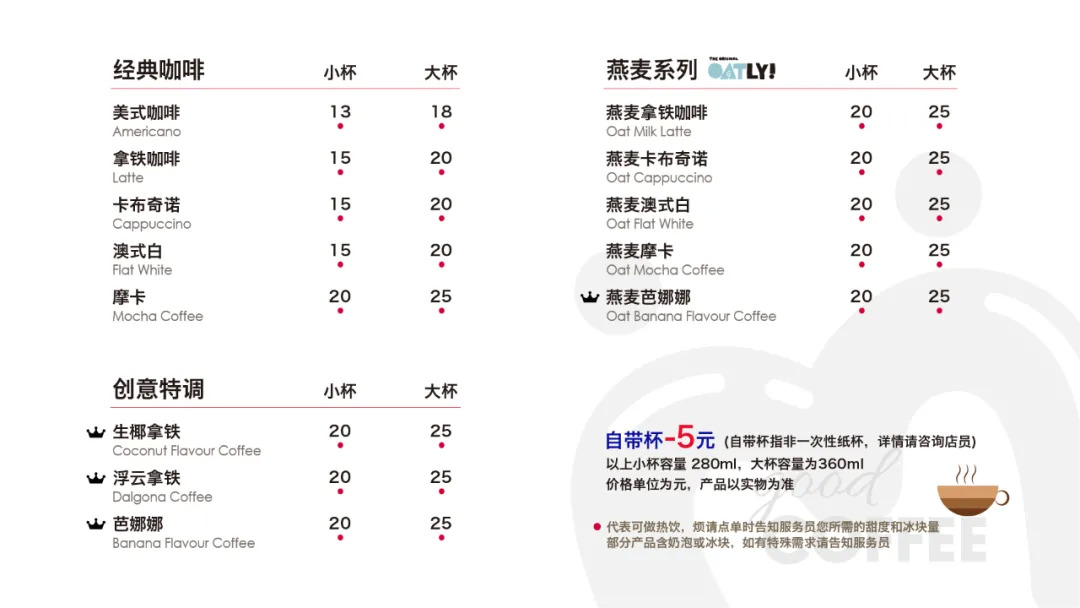 其中,菜单中单列“燕麦系列”,是本次门店升级的一个重要部分,包含5款咖啡饮品:燕麦拿铁咖啡、燕麦卡布奇诺、燕麦澳式白、燕麦摩卡和燕麦芭娜娜,全部使用OATLY燕麦奶,价格统一,小杯20元,大杯25元。