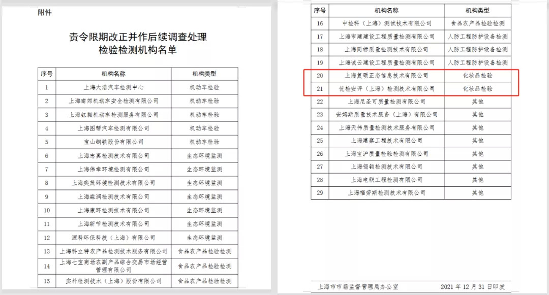 从监督抽查情况来看,仅12家机构“通过”抽检,其他100余家机构的结果或是“自行整改后通过”,或是“责令限期改正”,不合格率高达9成。其中,被随机抽检的5家化妆品检验机构中上海复硕正态信息技术有限公司(下称“上海复硕”)、优检安评(上海)检测技术有限公司(下称“优检安评”)2家被要求责令限期改正并作后续调查处理。