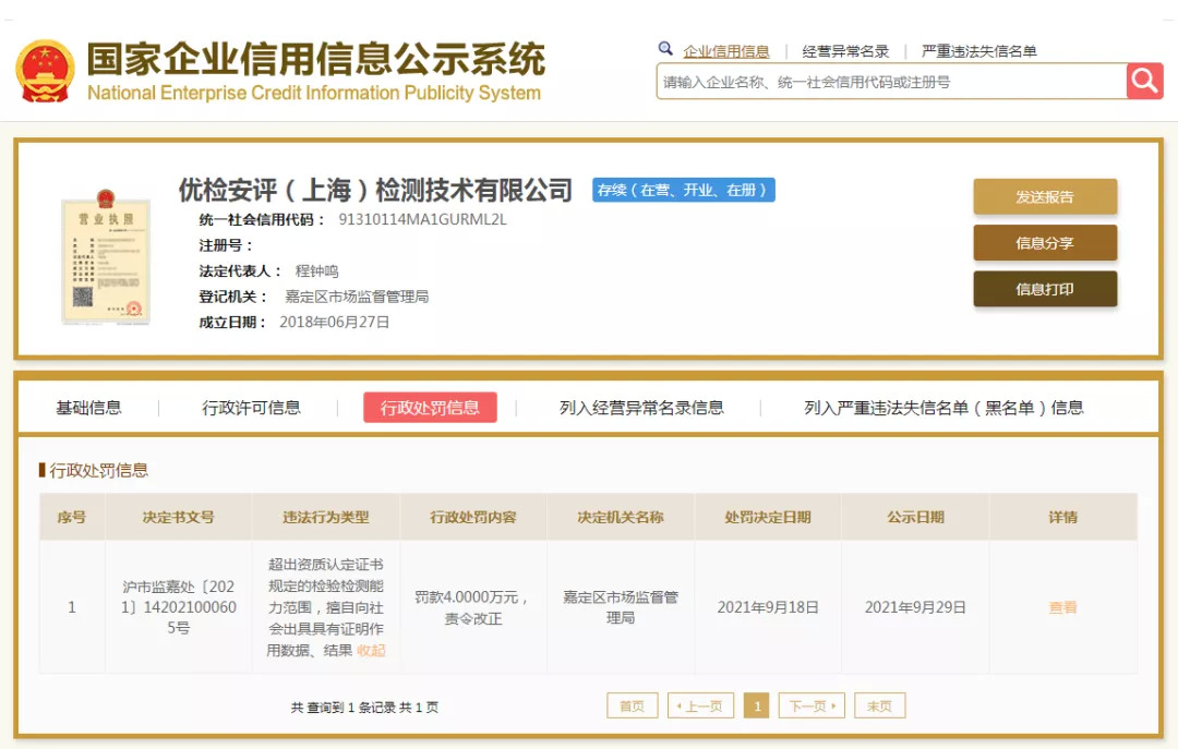 值得一提的是,青眼在国家企业信用信息公示系统查询到,优检安评曾于2021年9月被上海市嘉定区市场监督管理局进行行政处罚,罚款4万元,违法行为类型为“超出资质认定证书规定的检验检测能力范围,擅自向社会出具具有证明作用数据、结果”。
