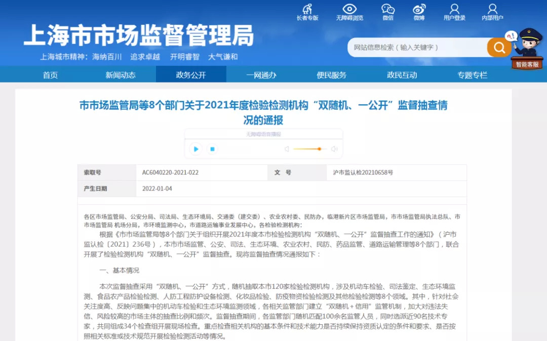 根据上海市市场监管局发布的《关于2021年度检验检测机构“双随机、一公开”监督抽查情况的通报》(下称《通报》),此次监督抽查是上海市市场监督管理局、上海市公安局、上海市药品监督管理局等8部门的联合行动,对全市涉及化妆品检验等8个领域的120家检验检测机构展开监督抽查。