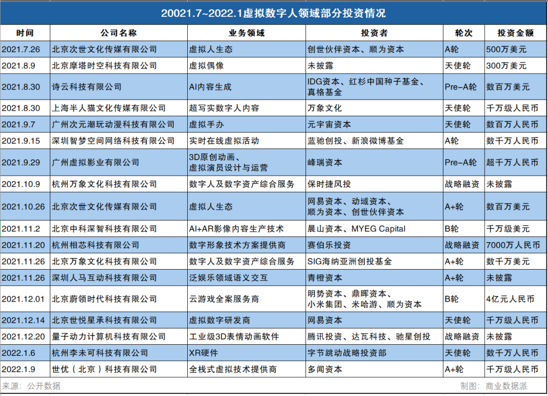 事实上,自2021年7月扎克伯格大炒元宇宙概念以来,科技企业或多或少都开始了元宇宙的布局。在国内,据商业数据派不完全统计,自2021年7月以来,一级市场虚拟人相关的核心投融资事件已达到18次。