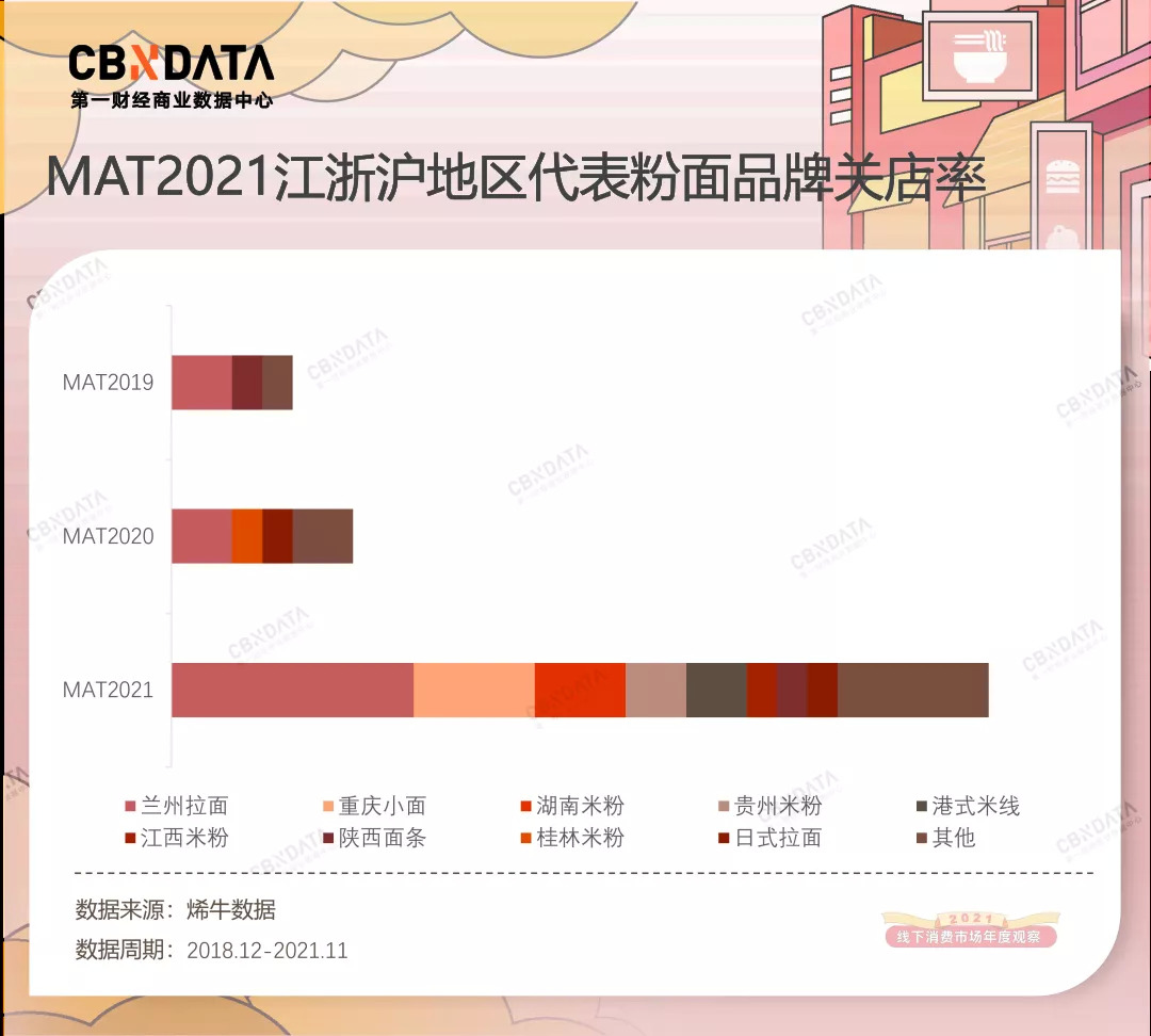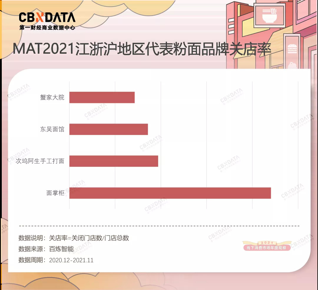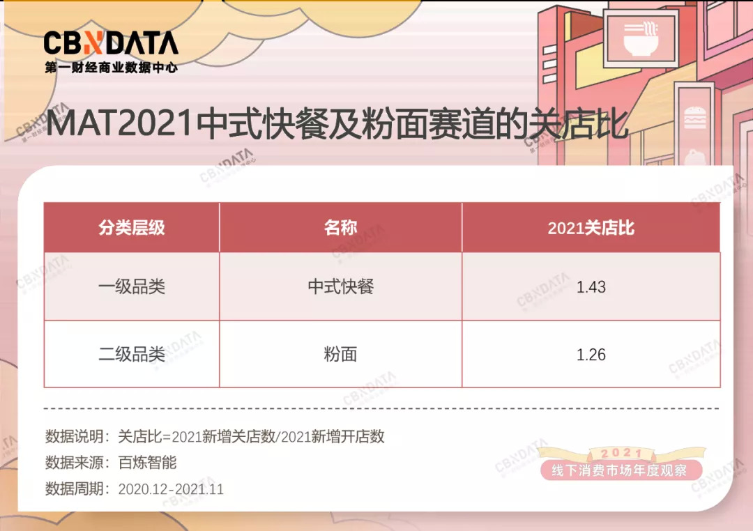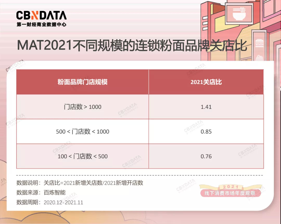 以品类来衡量,粉面所在的中式快餐规模小、成本低、产品简单、消费高频,是最具“万店基因”的赛道。新融资的粉面品牌仍在快速拓店,满足资本的期待,但大型连锁粉面品牌在2021年的关店趋势依然让人担忧。新旧品牌替换之下,行业应该思考的或许是:如何在保住基本盘的同时,多维度发力,分摊市场上的诸多风险和威胁。