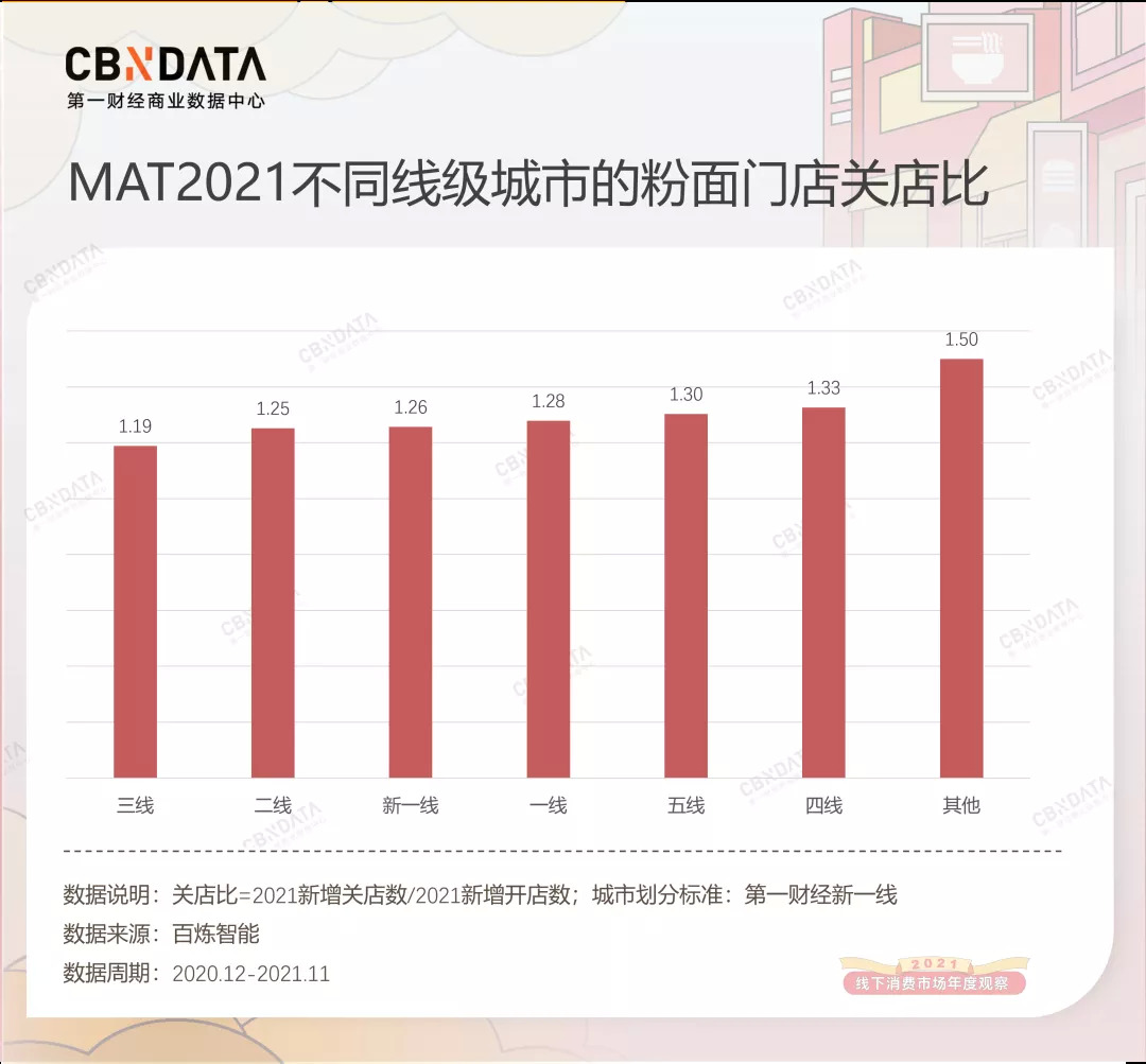 从一线下沉到低线城市,似乎是粉面品牌更可行的拓店路线。“下沉”的定义,并非限于进入七八线县城。对于许多诞生于一线城市的粉面品牌而言,从一线延展至新一线、二线、三线城市,同样不失为一种下沉。根据百炼智能数据,尽管近70%的粉面门店分布在一线、新一线城市,但2021年关店比最低的却是二、三线城市,这意味着粉面品牌正在这里加速铺店。