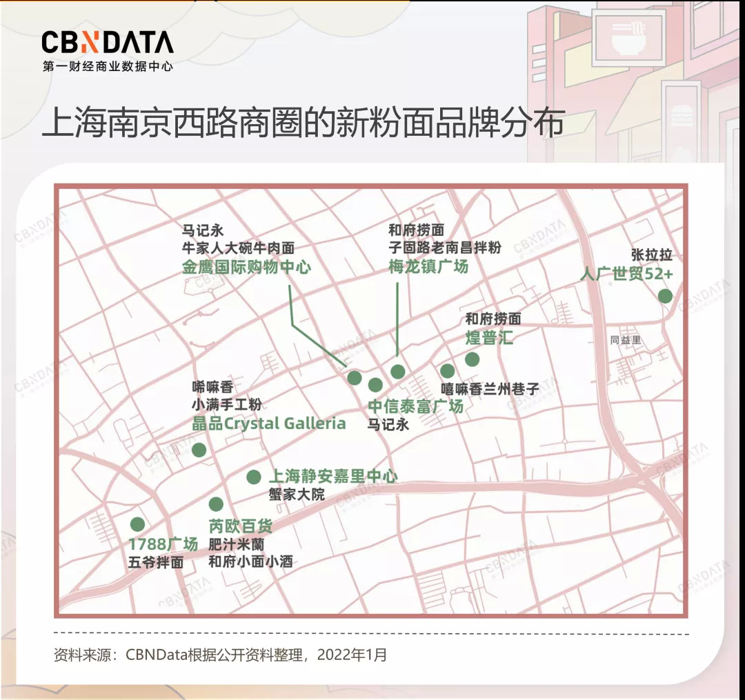 以上海南京西路商圈为例,和府捞面、马记永、五爷拌面、蟹家大院等近几年涌现的新粉面品牌,密集分布在4平方公里左右的狭长商圈内。马记永更是在相邻的金鹰国际购物中心和中信泰富广场同时布局了两家门店。值得注意的是,尽管分布密集,但极少有商场会在同一时间引进两家相同品类的粉面品牌。比如芮欧百货引进的是拉面系列的和府小面小酒,以及港式米线肥汁米蘭,梅龙镇广场选择了和府捞面,以及子固路老南昌拌粉。这样的偏好也说明了,粉面赛道未来在核心地段、商场的争夺上竞争激烈,尤其2021年集中拿到融资的兰州拉面品牌们,马记永、陈香贵、张拉拉们或会掀起一场门店抢夺战。由此衍生的哄抬租金问题,又将反过来施压新粉面品牌。