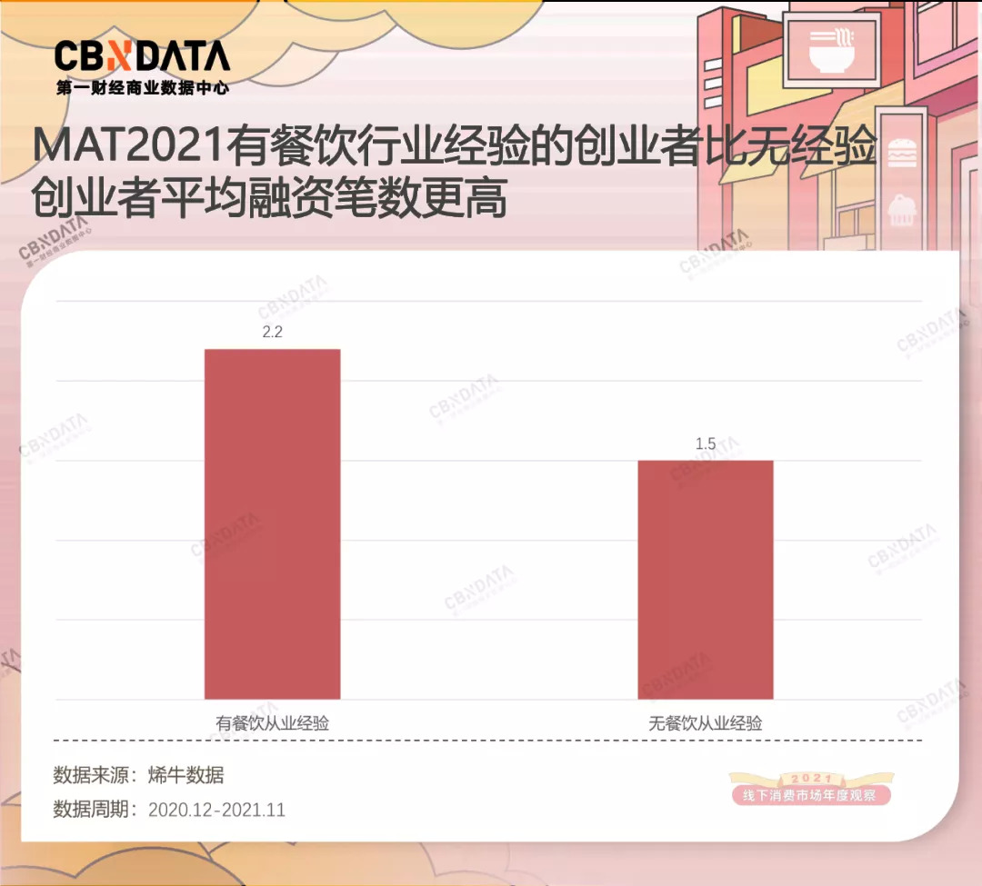 或因于此,资本现在愈发冷静,青睐有餐饮从业背景的创业者。2021年,有餐饮从业经验的创业者被资本押注的平均次数,远超无从业经验的创业者。遇见小面创始人宋奇,毕业后相继任职于麦当劳、百胜餐饮,2012年后创业做过粤式快餐、东北饺子;陈香贵创始人姜培军1999年即加入顶新集团旗下品牌德克士,熟悉餐饮行业前后端、上下游供应链的各环节;张拉拉创始人张晓慧是连续餐饮创业者,此前做的觅姐麻辣烫,已达千家门店;大师兄创始人郑如师原为九毛九集团总经理,后离开创业,2年创立了3个餐饮品牌。