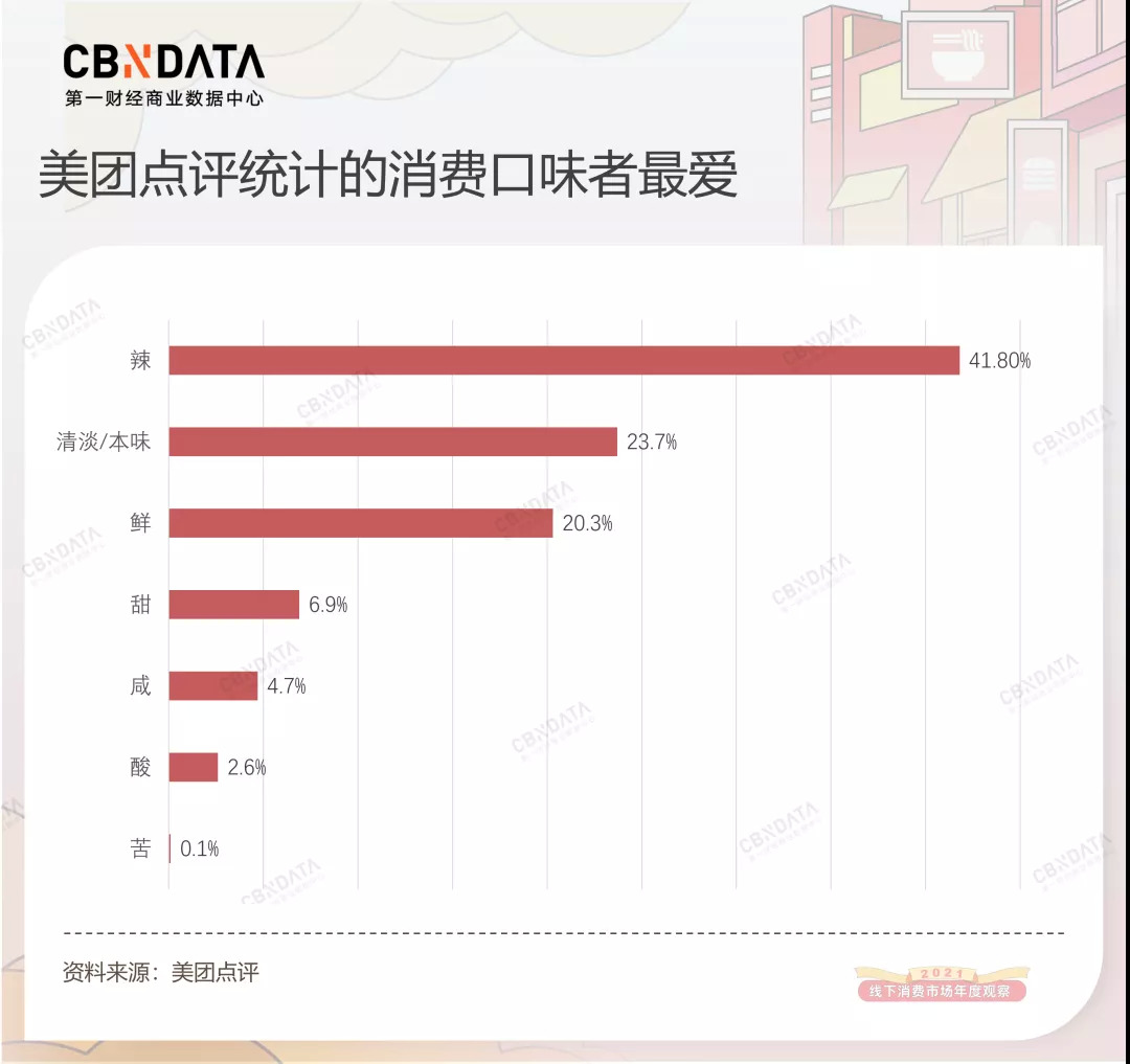 不同地域特色的粉面,在跨地域扩张时表现出的适应力,有着明显差别。CBNData发现,偏向咸辣口味的地域粉面,如兰州拉面、湖南米粉、重庆小面、贵州米粉等,对比口味清淡的江浙沪粉面,更具跨地域扩张能力。这或是源于辣味的普适性及上瘾性。根据美团统计,消费者最喜爱的口味中,辣味以41.8%的比例位于榜首,远超第二名清淡口味。