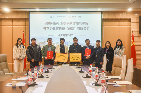 1月10日,天下秀教育与四川科技职业学院乡村振兴学院举行战略合作签约仪式。四川科技职业学院副校长向宏志、乡村振兴学院常务副院长高善峰、天下秀教育总经理郭镭、西南区总监李伟博等出席签约仪式,双方代表在现场签订了《战略合作框架协议》并进行共建基地授牌。