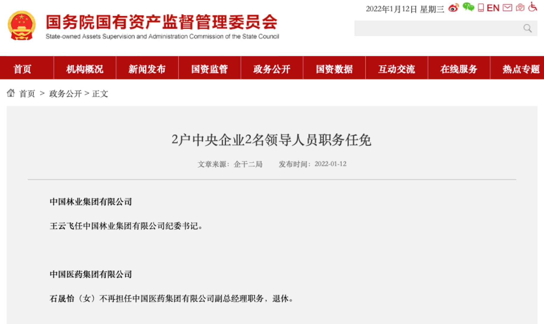 1月12日消息,国务院国资委网站发布2户中央企业2名领导人员职务任免情况。