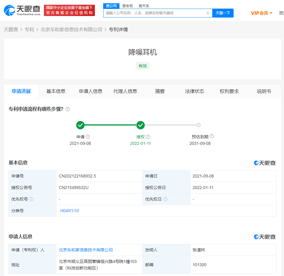 据天眼查App显示,1月11日,理想汽车关联公司北京车和家信息技术有限公司获得“降噪耳机”专利授权。