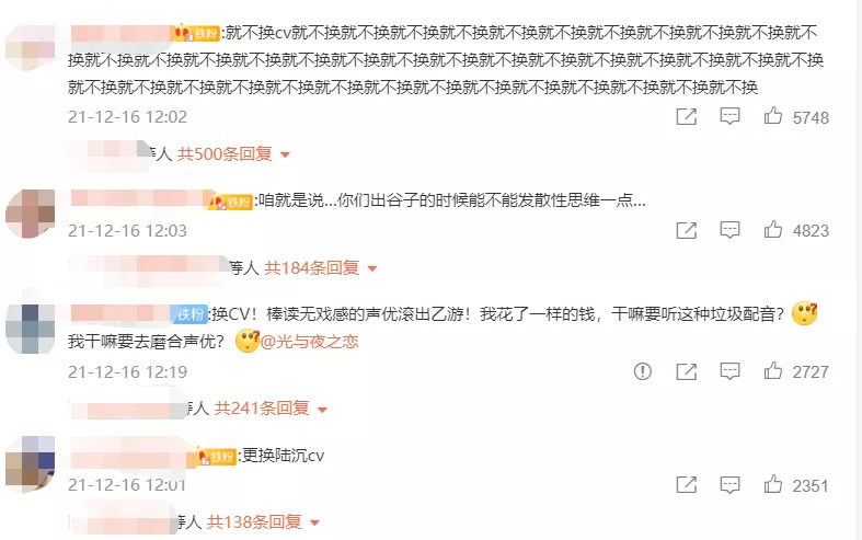 以为CV风波就此告一段落,没想到新CV官宣才是血雨腥风的开始。“阿旦业务能力也太差了,我一个素人都听不下去”“换CV,要顶尖商配老师,不要阿旦”,点进超话及官微评论区,全是“陆夫人”维权的身影。