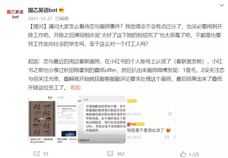 画师若违反规定固然有错,但在举报弄掉别人饭碗后,幸灾乐祸地说一句“她校招凉了吧”,也实在令人齿冷。这样的故事不是个例,在乙游圈子里,发动群众力量踢翻某个打工人的工作并不罕见,当然,谁也不觉得自己错了。