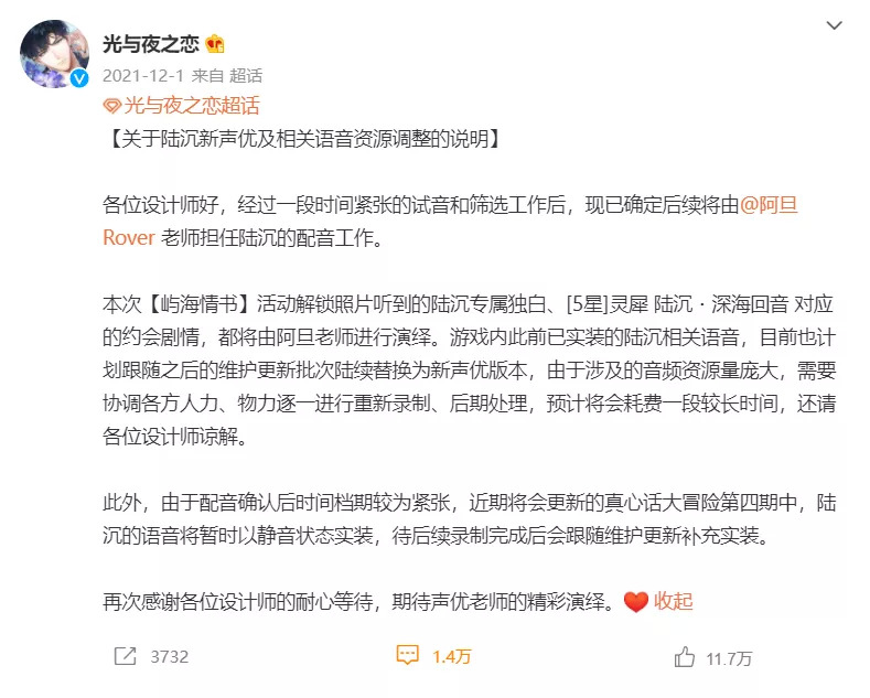 “我感觉也没那么差啊,磨合一段就好了呗。”官方对玩家行为并未作出回应,胡桃跟其他玩家一样,觉得官方是在冷处理,过了这阵就好了。没想到12月29日,官微突然发文,称阿旦所属工作室违反保密协议,《光夜》终止与阿旦的合作关系,并寻找新CV。