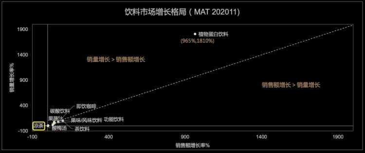 根据天猫新品创新中心公布的报告,在所有饮料品类中,凉茶增长格局略显尴尬,整体销量增长率和销售额增长率处于几乎垫底的位置。