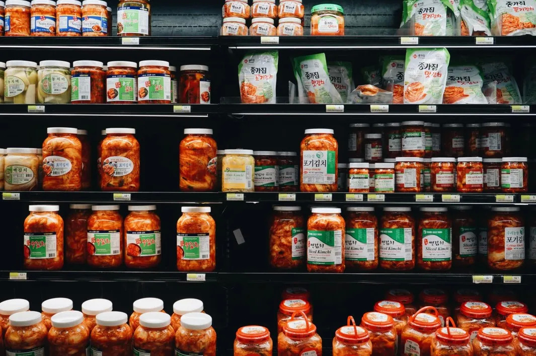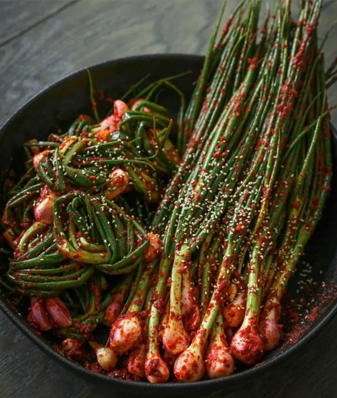 对,我在韩国超市里见到过满柜的泡菜,还非常东北地腌上了蕨根,小根蒜等春日野菜。当时买的时候,都是装在精致塑料盖小盒里的,想不到那里面的红色腌料,制作过程其实非常豪放。
