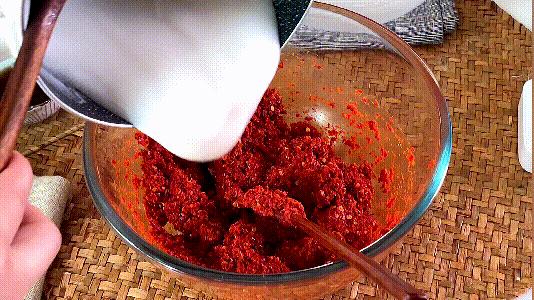 尤其是拍成视频,每一段都有自己的魅力,光是“搅拌”都具有好几个层次,搅拌机里的急速粉碎仿佛摇滚;而把糯米粉稀释成糊状,则突然在色泽上和情调上都变得优雅;粗细两种辣椒面用开水一拌,鲜香辣的感觉,仿佛要从屏幕里溢出来;再用手把这一切和韭菜或者小葱搅拌在一起。