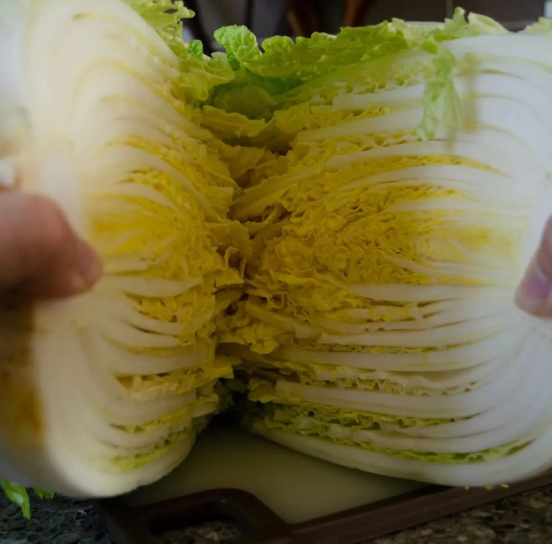 将白菜粗率地一剖为二,入冬的白菜脆劲十足,应声而开,刀锋没有任何阻碍或者粘连,又简单又快,像是一段“你要不要跟我谈恋爱,不谈拉倒”的表白,硕大到要一只大金毛狗合抱的冬季大白菜就袒露出了它带着嫩黄的千层内心,对率真个性的人,是天赐玛娜。