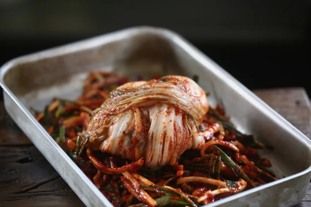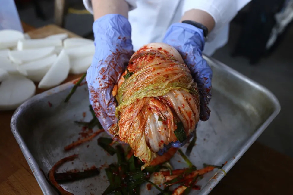 放原料的画面,充分体现了东北亚地区的地大物博和豪情万丈,四五颗大白菜,每颗切开成四瓣,就已经是满满的一盆,要驯服这些冬日甘甜之物,鱼露是论整瓶倒的,糖和盐是半袋半袋往里倒,有助发酵的糯米糊,调出来要铺满整个盆底……
