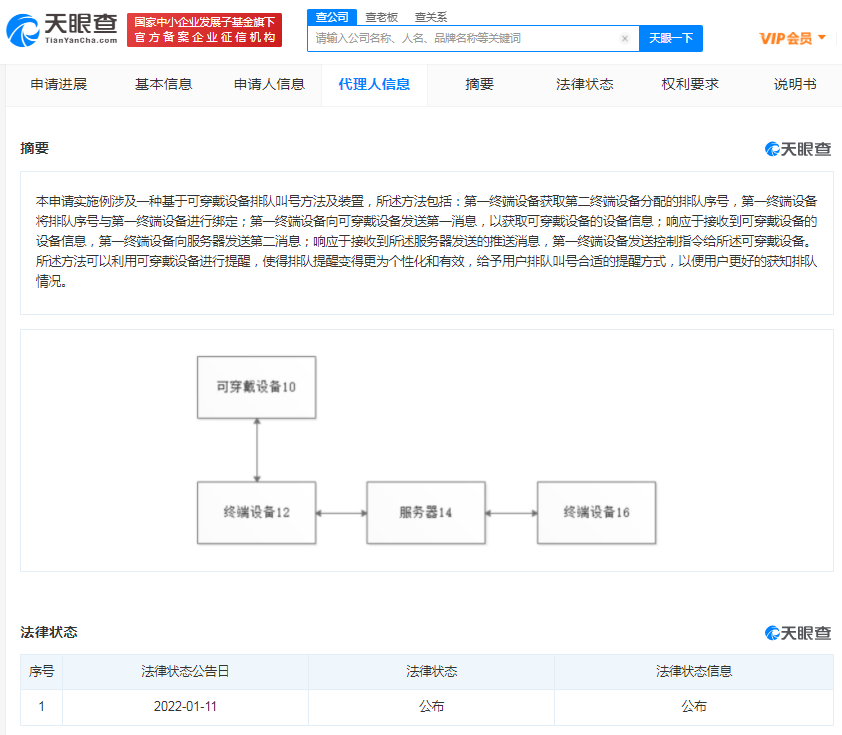 天眼查App显示,1月11日,荣耀终端有限公司公布“一种基于可穿戴设备排队叫号方法及装置”专利。