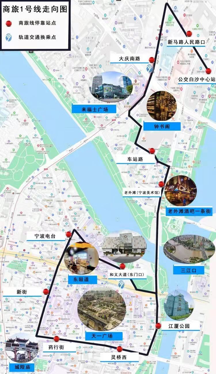 商旅1号线不同于其他公交,其站点均是博物馆、鼓楼、老外滩等这些深具“宁波味道”的地标景点。商旅1号线路串联起来的建筑处处是宁波商帮百年发展的缩影,随着车厢的移动,宁波这座商邦之城的今昔风华清晰地呈现在我们的面前。