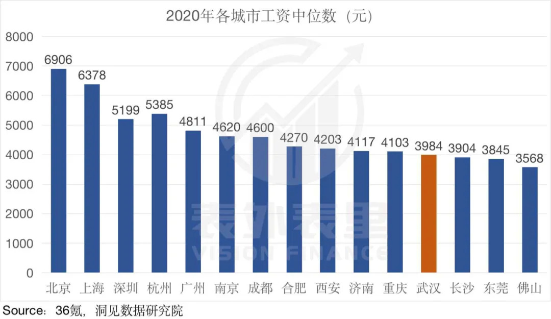 不过,这是充满灵性、被平均后的收入支出水平。如果按薪资中位数算的话(如下图),偌大的武汉,像阿代这样的普通大学毕业生,靠一成不变的岗位工资,很难挣到一席之地。