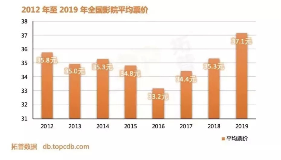 2012年-2019年全国影院平均票价趋势图;来源 / 拓普电影数据库