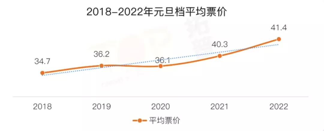 根据拓普数据统计,疫情之后,元旦档平均票价大幅上涨过一次,由2020年的36.1元上涨到2021年的40.3元,涨幅达11.6%。2022年元旦档平均票价达41.4元,相较于2021年的均价又增长了2.7%,再创新高。