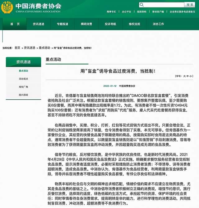 1月12日,中消协发文点名称,肯德基此次联名营销“有悖公序良俗和法律精神”。