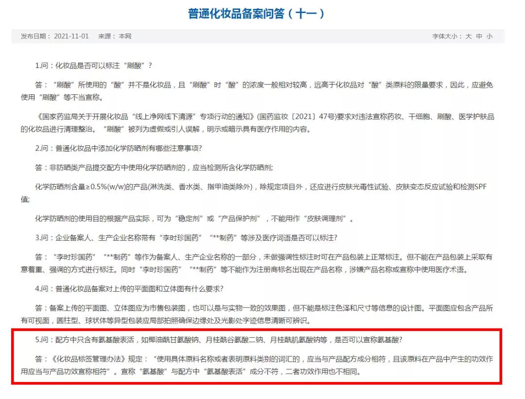 值得一提的是,对于仅添加氨基酸表活能否宣称氨基酸一事,业界早就存在疑惑,就此,去年11月,广州市监局在普通化妆品备案问答(十一)中加以明确,指出根据《化妆品标签管理办法》规定:“使用具体原料名称或者表明原料类别的词汇的,应当与产品配方成分相符,且该原料在产品中产生的功效作用应当与产品功效宣称相符”。宣称“氨基酸”与配方中“氨基酸表活”成分不符,二者功效作用也不相同。若配方中只含有氨基酸表活,如椰油酰甘氨酸钠、月桂酰谷氨酸二钠、月桂酰肌氨酸钠等,不能宣称“氨基酸”。