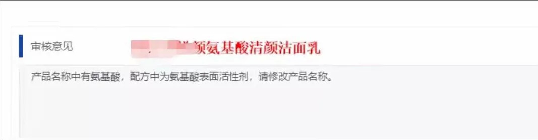 上述被打回备案的企业相关负责人向青眼介绍,近期该公司备案的一款名为“XXX氨基酸清颜洁面乳”被打回了,原因为“产品名称中有氨基酸,而配方中添加的是氨基酸表面活性剂”,要求修改产品名称。