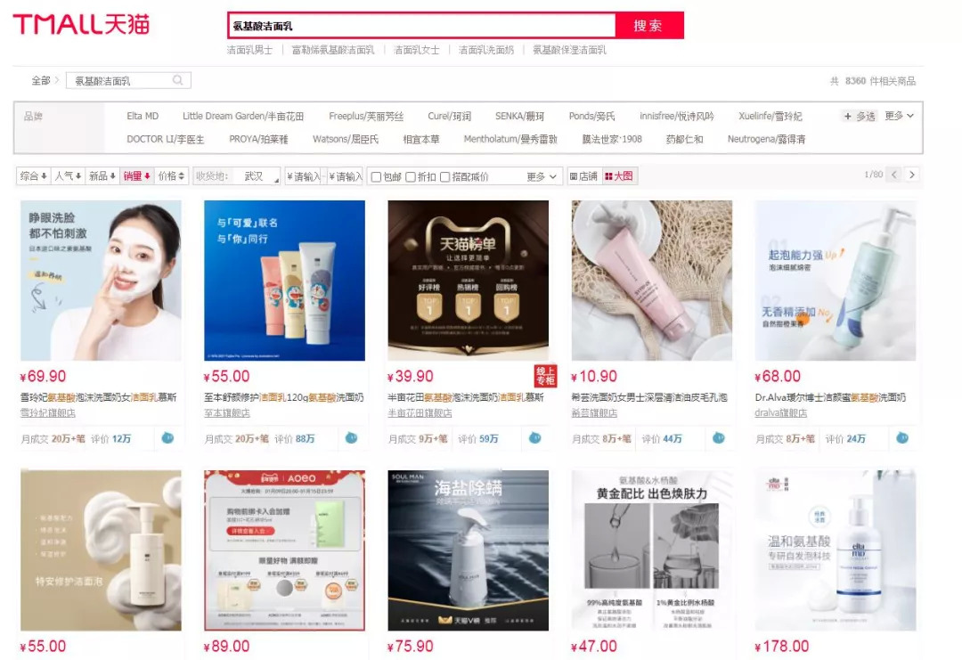 青眼在天猫平台以“氨基酸洁面乳”为关键词进行搜索显示,有超8300件相关商品。包括了雪玲妃、至本、半亩花田、AOEO、完美日记、科颜氏、SK-II 、芙丽芳丝等国内外品牌。仅洁面来看,可以说已经到了“无氨基酸不洁面”的地步。