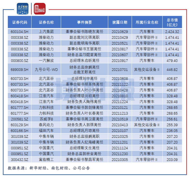 图3:2021年汽车行业高管离任情况(总市值200亿元以上公司)
