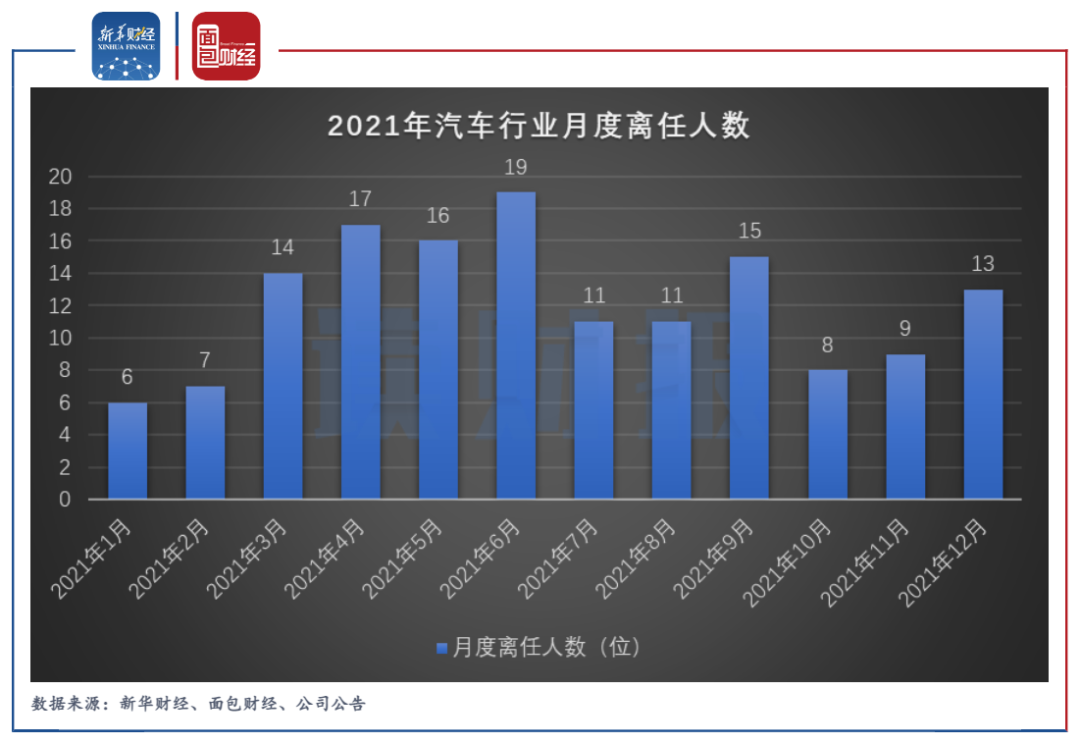 从月度数据上看,2021年6月份为汽车行业管理层离任的高发月份。6月份共计有19位董事长及高管离任。