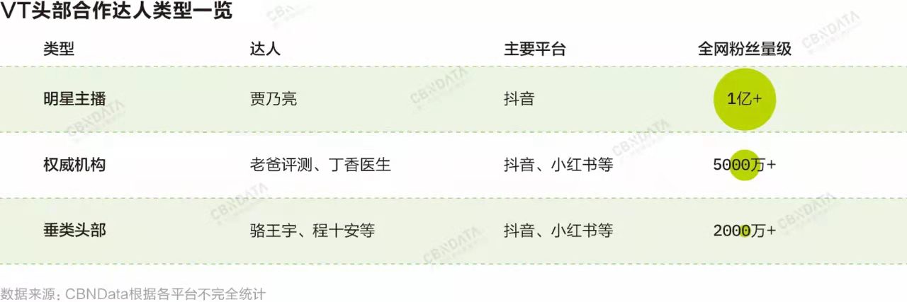 华玉锋向CBNData表示,VT目前正在推广升级后的三代老虎系列产品,主要选择与三类达人合作。第一类,权威背书类。通过美丽修行、老爸评测、丁香医生等权威机构深度合作,强化产品的安全性和功效性;第二类,明星主播。VT与贾乃亮等知名带货明星签订了代言年框等深度战略合作;第三类,垂类头部种草达人,如骆王宇、程十安,在美妆领域拥有核心影响力,也能直接传达品牌的产品力。