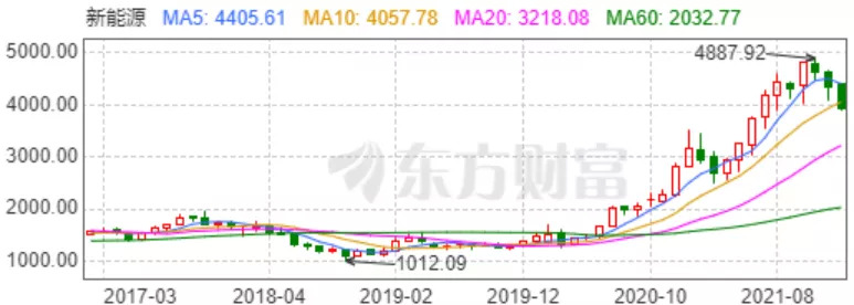 新能源的狂潮已从2018年10月起持续了3年有余,整个新能源指数从最低1012.09点在2021年11月达到顶峰4887.92点,涨幅高达392.95%。