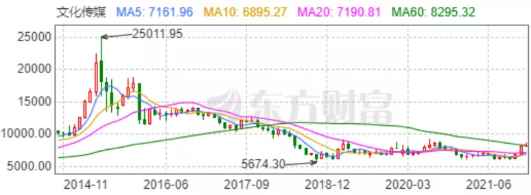 相比新能源中各主要赛道的情绪高涨,曾在2013到2015年间风靡一时的文化传媒板块却经历了6年寒冬,其板块指数从2015年6月最高的25011.95点,一路回调至2018年10月的5674.30点,回调幅度达到77.31%。