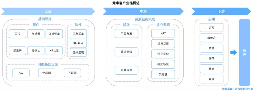 根据行行查研究,“元宇宙”这个巨大的世界将由三部分产业环节构成——基础设施(硬件软件)、要素服务集成(服务)、应用及内容三个方面。其底层技术包括人工智能、数据协调、网络基站、服务器、VR设备等;服务板块是承载用户线上身份的媒介,包括NFT、虚拟货币、数字内容等要素;内容及应用板块则是最终于游戏、教育、医疗等场景的落地。