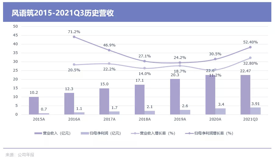 从财务表现看,近几年风语筑增长快速。根据三季报,公司前三季度实现营收22.47亿元,同比增长36.21%, 实现归母净利润3.91亿元,同比增长42.27%。